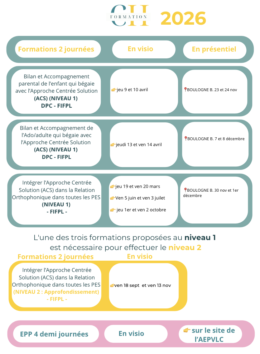 « une formation innovante axée sur la communication, une méthode (l’Approche Centrée Solutions) qui va révolutionner ma pratique car elle a déjà révolutionné ma façon de voir les choses – Des exercices concrets en petits groupes, une bonne communication entre les participantes – une formatrice bienveillante, encourageante et aussi très efficace dans sa communication, ses supports, sa présentation en distanciel: merci Caroline! – une autre façon d’aborder le bégaiement – des schémas faciles, des métaphores parlantes et vite compréhensibles »